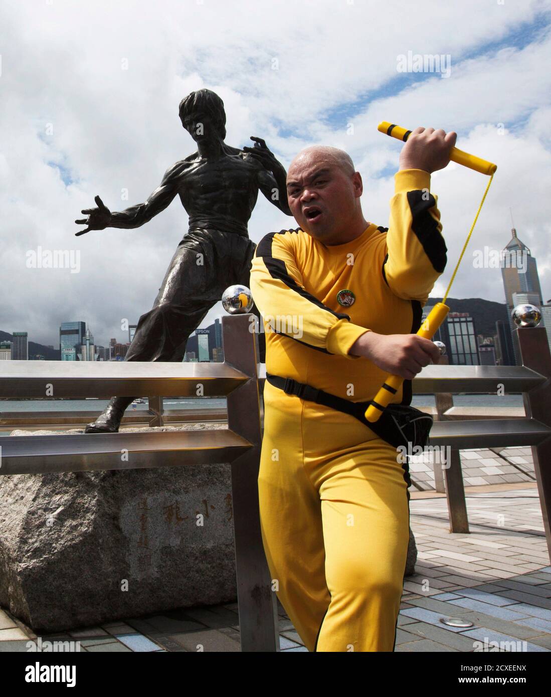Abe Kazuo A Japanese Fan Of The Late Kung Fu Legend Bruce Lee Poses With A Pair Of Nunchucks In Front Of A Bronze Statue Of Lee On The Waterfront Of Hong