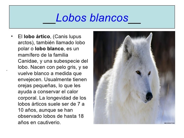 Blanco Granja de Lalin, Pontevedra en Argentina y Guatemala Rocio Blanco de Lusky 5//06 Re Blanco Granja de Lalin, Pontevedra en Argentina y Guatemala Richard Blanco 9//10 Blancos from Tilden Tx Area Ernesto Guzman 4/24/09 Blancos from Mexico City via Yucatan Jaime A Blanco 7/24/06. El lobo ártico, (Canis lupus arctos), también llamado lobo polar o lobo blanco, es un mamífero de la familia Canidae, y una subespecie del lobo ANATOMÍA Los lobos árticos tienden a ser más pequeños que el lobo común Suelen ser de 1 a 2 metros de largo, incluyendo la cola;. Pero también supone un importante aprendizaje para los padres y los acompañantes Con ayuda de numeroso recursos y materiales pertenecientes a una colección propia, el aprendizaje está garantizado.