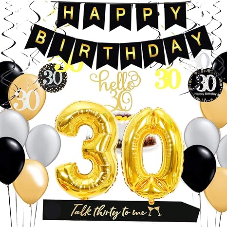 Amazon Com 30th Birthday Decorations Kit Gold 30 Number Balloons Black Happy Birthday Banner 30th Birthday Sash Hanging Swirls Hello 30 Cake Topper Dirty 30 Birthday Party Supplies Gold And Black Health