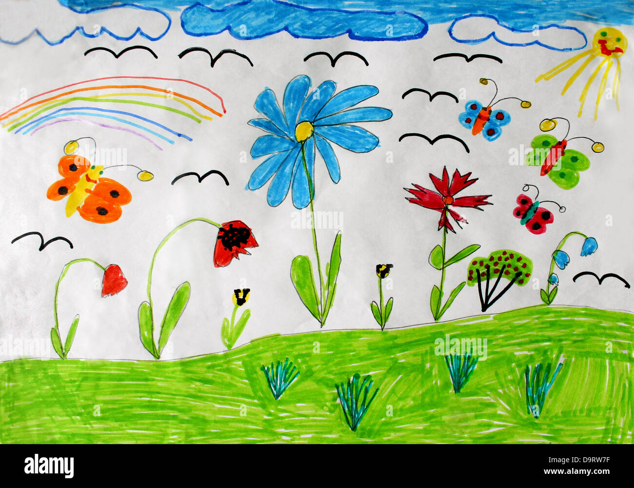 Dibujo Infantil Multicolor Con Mariposas Y Flores Fotografia De Stock Alamy
