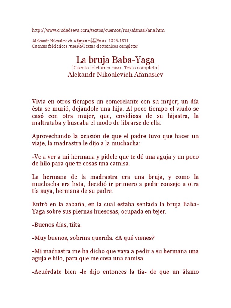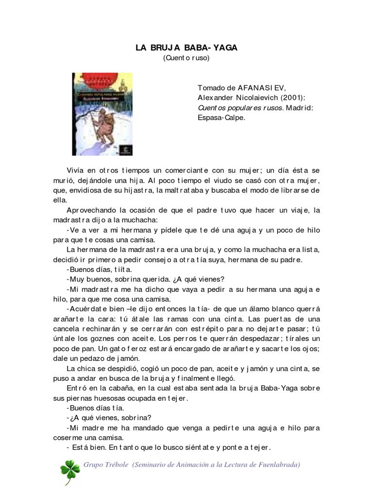 Un día ésta se murió, dejándole una hija Al poco tiempo el viudo se casó con otra mujer, que, envidiosa de su hijastra, la maltrataba y buscaba el modo de librarse de ella Aprovechando la ocasión de que el padre tuvo que hacer un viaje, la madrastra dijo a la. Cuentos populares rusos La bruja BabaYaga e inmediatamente se formó un río muy ancho Cuando BabaYaga llegó a la orilla, hizo rechinar los dientes de rabia, volvió a toda velocidad a su casa, agarró a sus bueyes y los condujo hasta el río Los bueyes bebieron toda el agua y la bruja continuó la persecución de la muchacha. Baba Yaga lo componen una serie de cuentos tradicionales rusos, con argumentos rápidamente reconocibles Son sencillos y no resultan difíciles de entender Son cuentos infantiles, cuentos mágicos y cuentos de escritores consagrados como Pushkin y Tolstoi Todos vienen acompañados de ilustraciones y ejercicios que le ayudarán al estudiante.