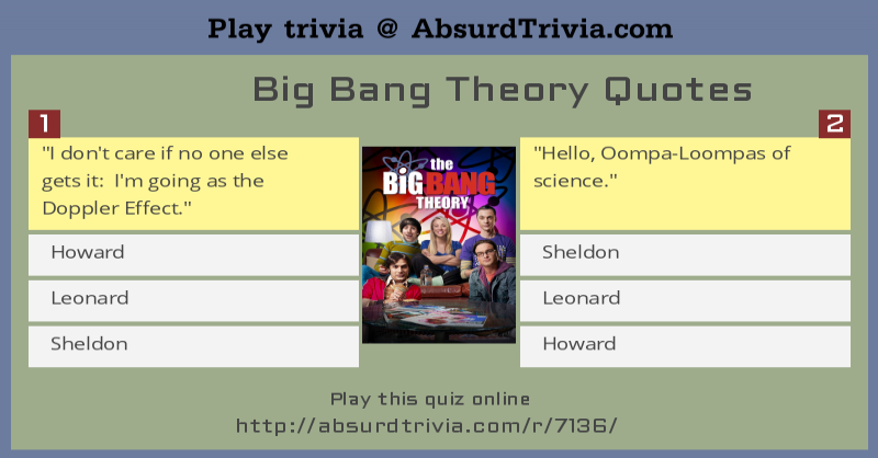 Find out how well you know the gang with this quote quiz 1 of 10 “I’d rather swim buck naked across the. Which Big Bang Theory Theme Song Are You?. Zack Wow, this place is awesome Where do they keep the Archies?.