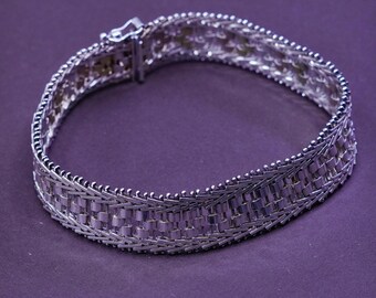 Vintage signed IBB ITALY, 925 sterling silver flat Riccio bracelet Measurements 18cm clasped by 12cm wide Total Weight 303 grams Hallmarks Signed IBB ITALY 925 ( IBB stands for International Bullion and Metal Brokers, the company was established in London in 1974) Condition Bracelet is in very good condition, please see photos for details. Precio regular 115,00 Pulsera Plata Ley Cola de topo entrelazada Precio regular 29,00. JAIENCAS MULTIVARIEDADES,seriedad y cumplimiento para sus compras ONLINETE TRAEPULSERA CARTIER HOMBRE EN PLATA ITALY 925Medidas 21 CM DE LARGO ANCHO 6 MM06 CMP 68 G APROXEN TEJIDO CARTIERGRATIS ESTUCHE DE REGALOFABRICADO EN PURA PLATA ITALY 925 EXCELENTE CALIDADLINDA PARA REGALARDESPEJA TODAS TUS DUDAS ANTES DE DAR CLICK EN COMPRARFOTOS 100% REALES DEL ARTICULOSOMOS.