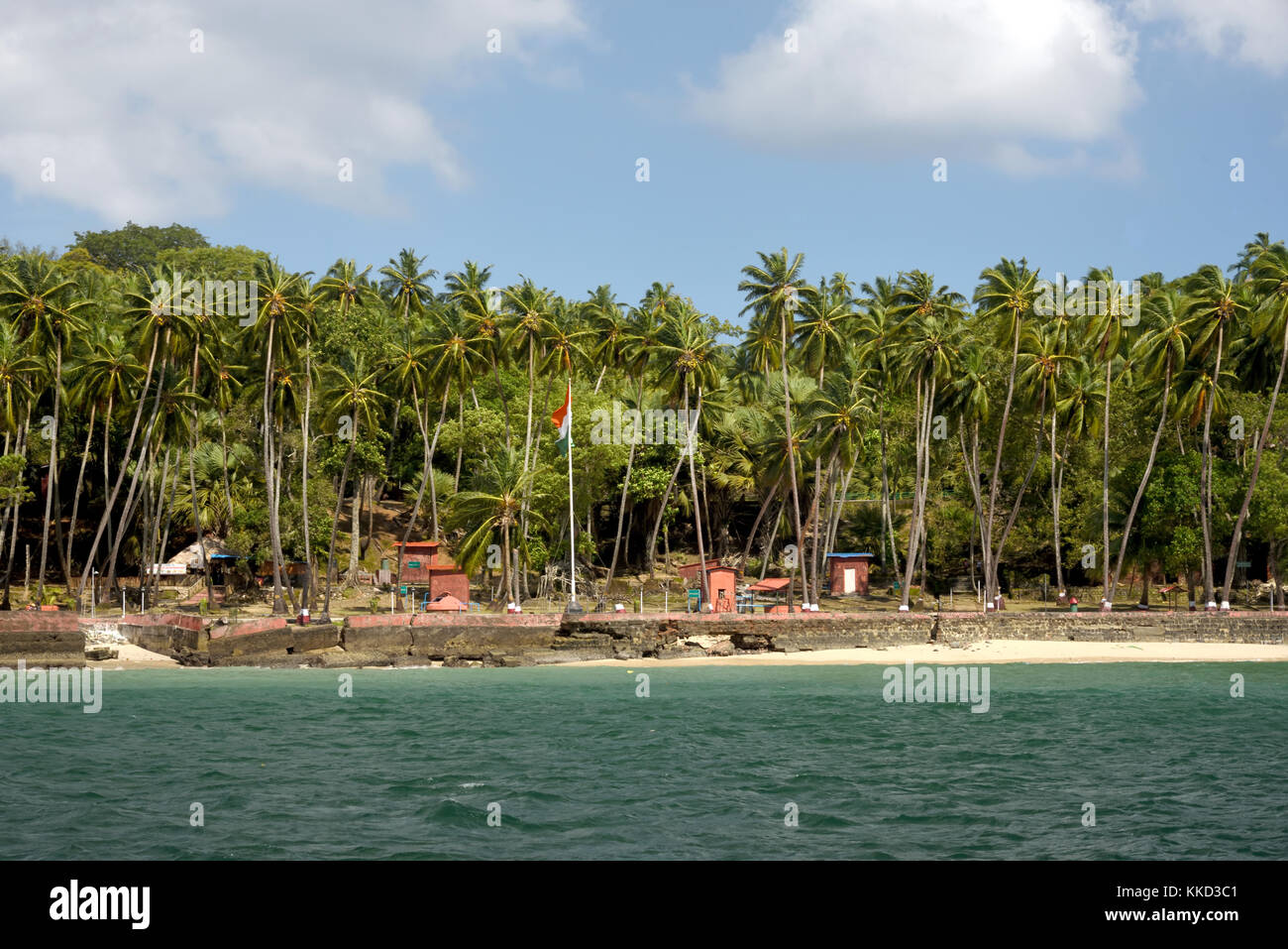 La Isla De Ross Escenica Bahia De Playa Del Mar De Andaman En La India Con Cocoteros Y Cabanas Fotografia De Stock Alamy