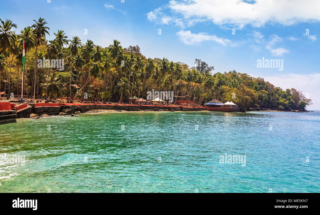 La Isla De Ross Escenica Bahia De Playa Del Mar De Andaman En La India Con Cocoteros Y Cabanas Turisticas Fotografia De Stock Alamy