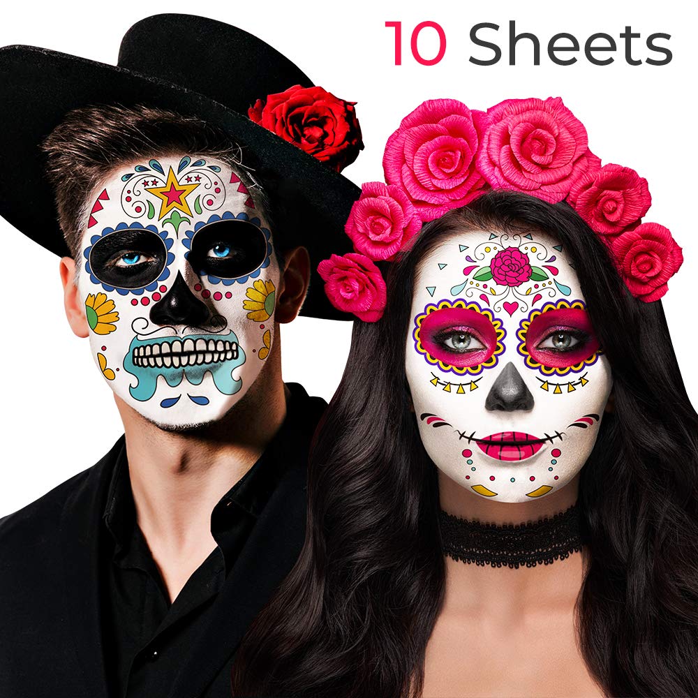 Amazon Com Day Of The Dead Face Tattoos 10 Pack Dia De Los Muertos Temporary Face Sticker Kit Halloween Decorations Sugar Skull Costume Makeup Decor Glitter Red Roses Skeleton Full Face Mask