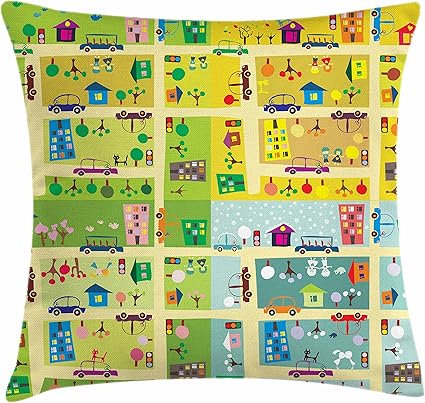 Funda De Cojin Con Diseno De Mapa De La Ciudad Para Ninos Diseno De Mapa De La Ciudad Con Dibujos Animados De Childish Y Apartamentos Funda De Almohada Decorativa Y Cuadrada Multicolor