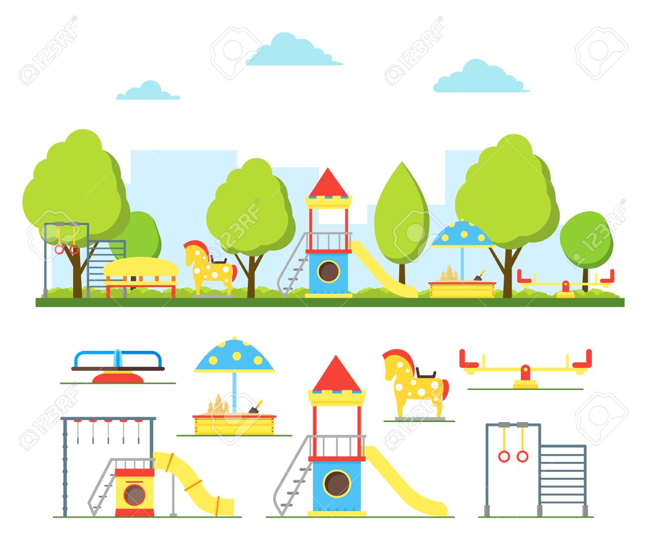 Zona De Juegos De Dibujos Animados En La Ciudad Y Conjunto De Elementos Para El Diseno De Estilo Plano De Los Ninos De Ocio Ilustracion Vectorial Ilustraciones Vectoriales Clip Art Vectorizado Libre