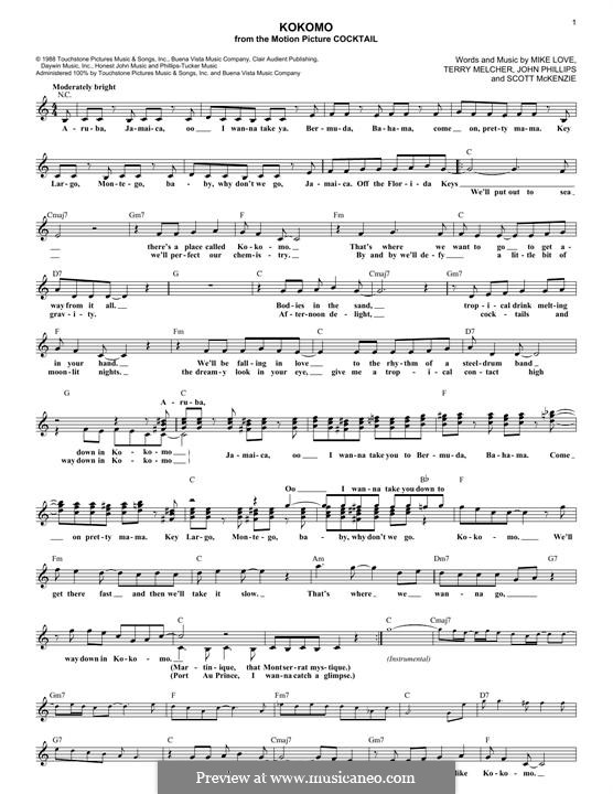 The Beach Boys – Kokomo Lyrics Aruba, Jamaica ooo I wanna take ya Bermuda, Bahama come on pretty mama Key Largo, Montego baby why don't we go Jamaica off the Florida Keys There's a place called Kokomo That's where you wanna go to get away from it all Bodies in the sand. Beach Boys Kokomo Lyrics Aruba, Jamaica ooo I wanna take you Bermuda, Bahama come on pretty mama Key Largo, Montego baby why don't we go Jamaica Off the Florida Keys There's a place called Kokomo That's where you wanna go to get away from it all Bodies in the sand. The Beach Boys Kokomo” is a song written by John Phillips, Scott McKenzie, Mike Love, and Terry Melcher and recorded by The Beach Boys in spring 19 Its lyrics describe two lovers taking a trip to a relaxing island in the Florida Keys called Kokomo, which is said to only be seen by those of pure heart It was released as a single on July 18, 19 by Elektra Records and became a No 1 Hit in the United States, Japan, and Australia (where it topped for about two months).
