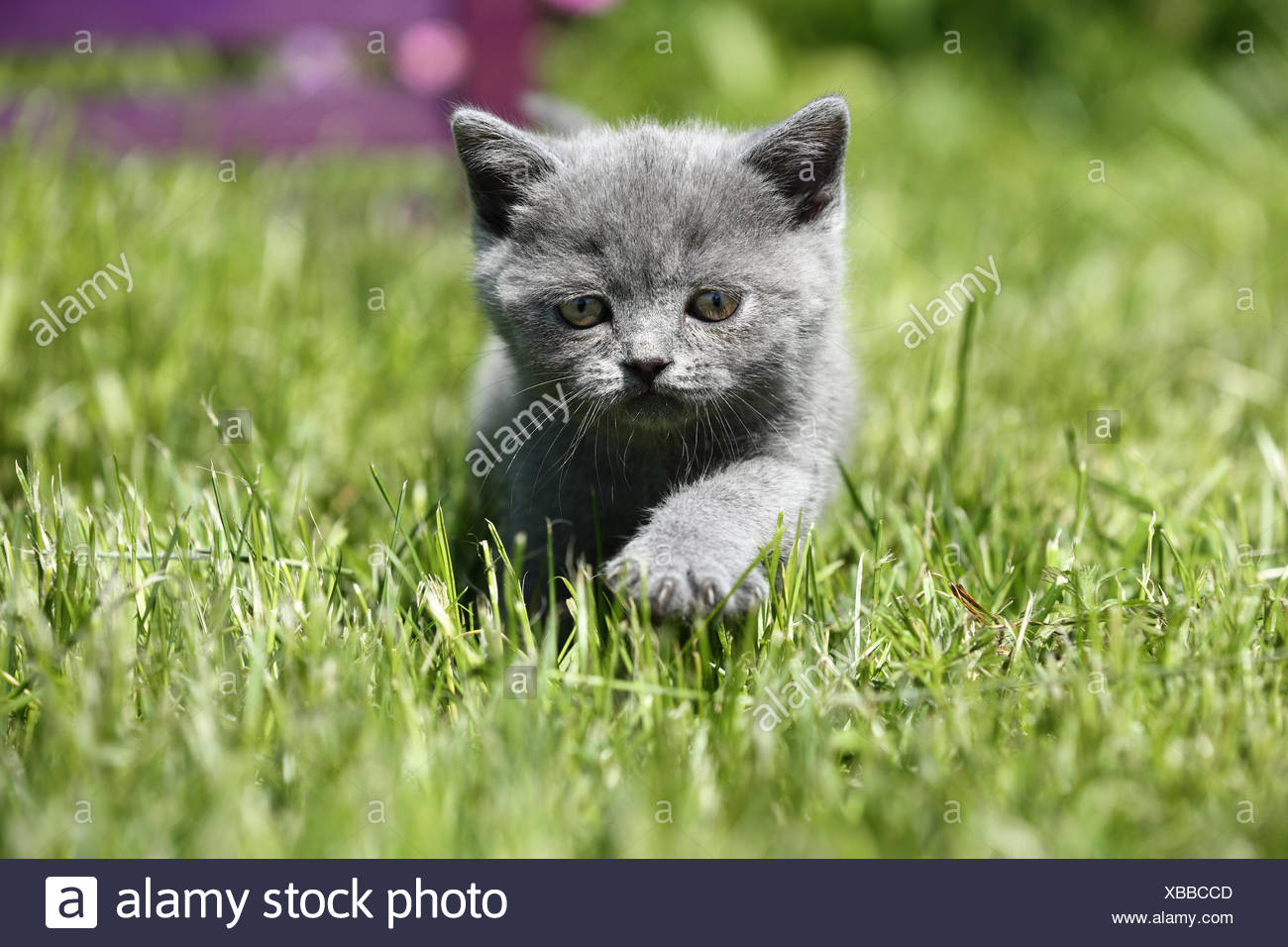 British Shorthair Gray Kitten 6 Weeks Old Walking On A Lawn Germany Stock Photo Alamy
