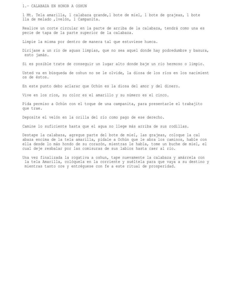 8 ebbo a oshunse le cocina un parguito, con almendras y se le pone arriba a oshun y cuando espieza adescomponer se le echa oÑi, y se lleva a la manigua9 addimu a oshun5 yemas crudas, a cada una se le echa una chucharada de azucar blanca, canela en polvo,oÑi, y grajeas de colores, se ruega 5 dias y despues al rio10 addimu a oshun5. Obra con calabaza para Oshún Por Ashé pa mi Cuba La mágica calabaza con quién trabaja nuestra bella Oshún, la Diosa de los Ríos, tiene muchos usos y dones, entre ellos la fertilidad, rituales para atraer el amor, la paz, intuición, unión de lazos familiares y amantes En obras, rituales y trabajos religiosos se utiliza todo el fruto, sus tallos y hojas, sirven para guiar sueños, para realizar perfumes, para alejar maleficios, y hasta para embellecer el alma y el espíritu. 1 CALABAZA EN HONOR A OSHUN 1 Mt Tela amarilla, 1 calabaza grande,1 bote de miel, 1 bote de grajeas, 1 bote lla de melado ,1veln, 1 Campanita Realice un corte circular en la parte de arriba de la calabaza, tendr como una es pecie de tapa de la parte superior de la calabaza Limpie la misma por dentro de manera tal que estuviese hueca.