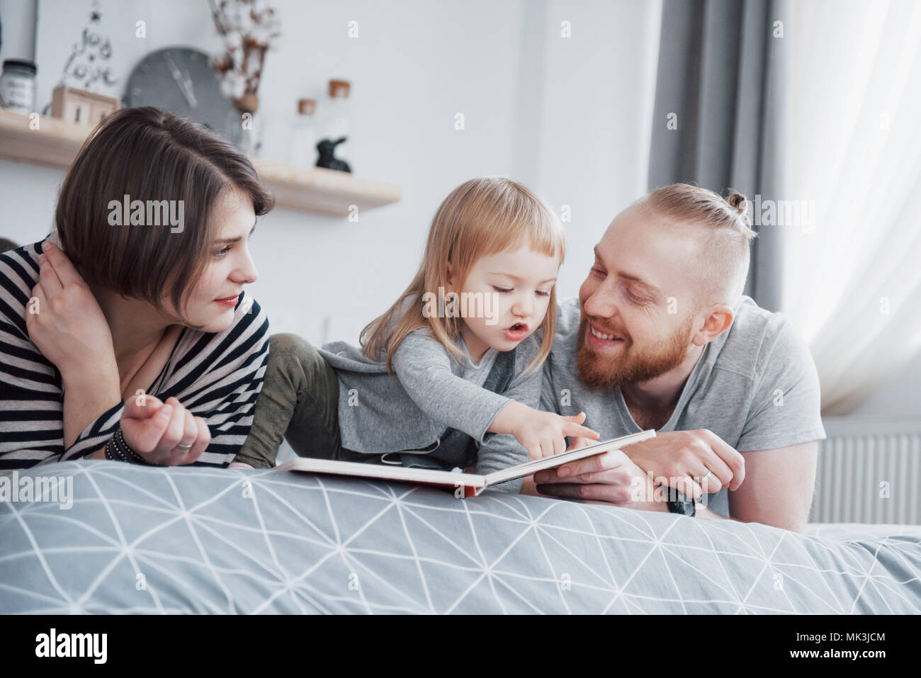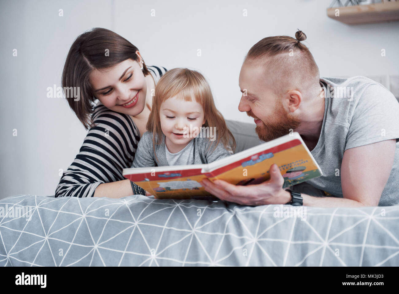 Familia De Tres Miembros La Gente Sentada En La Cama En El Dormitorio Libro De Lectura Padre E Hijas Ninas En Casa Pasar Tiempo Juntos Hablando De Padres De Comu Fotografia De