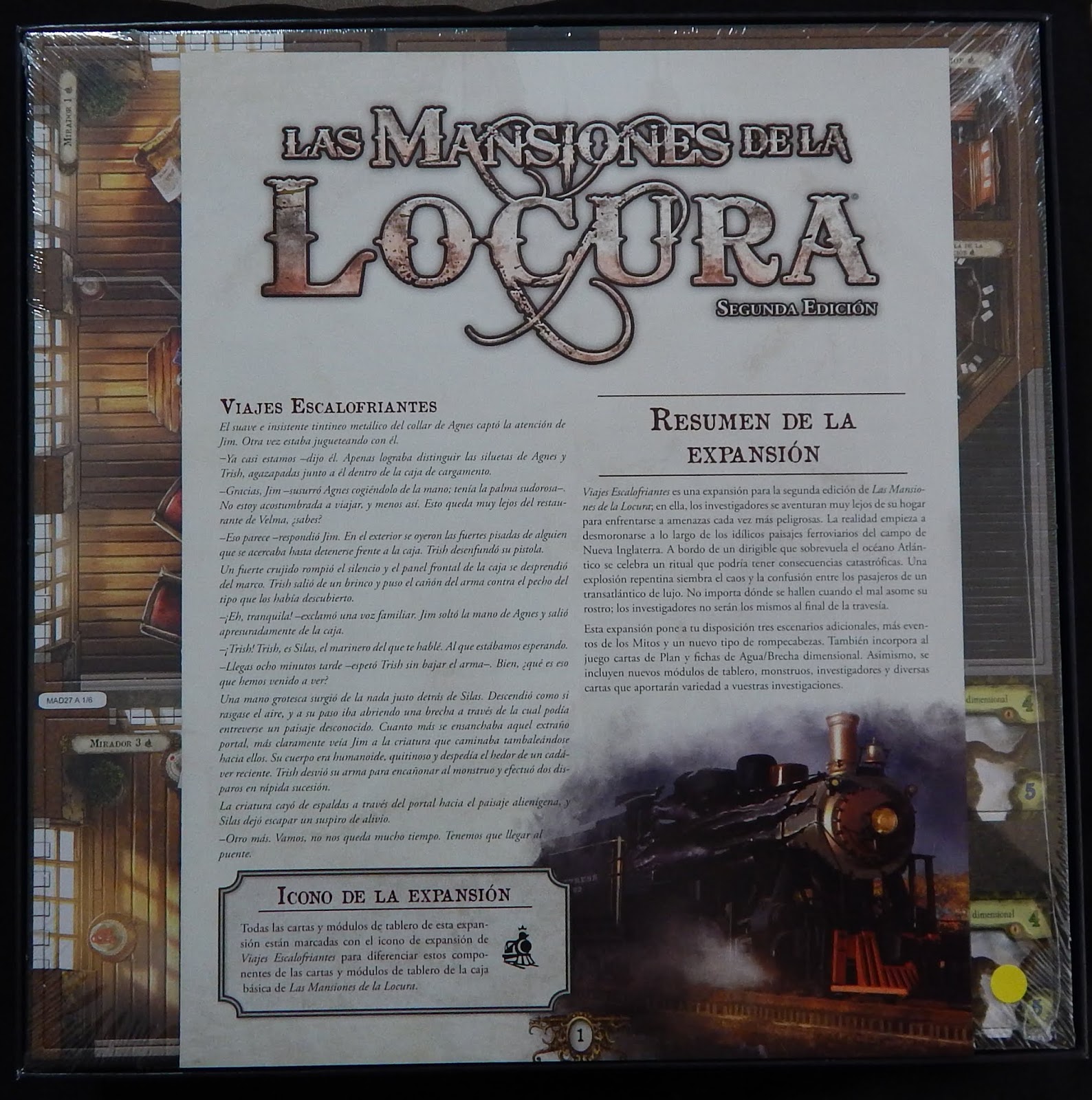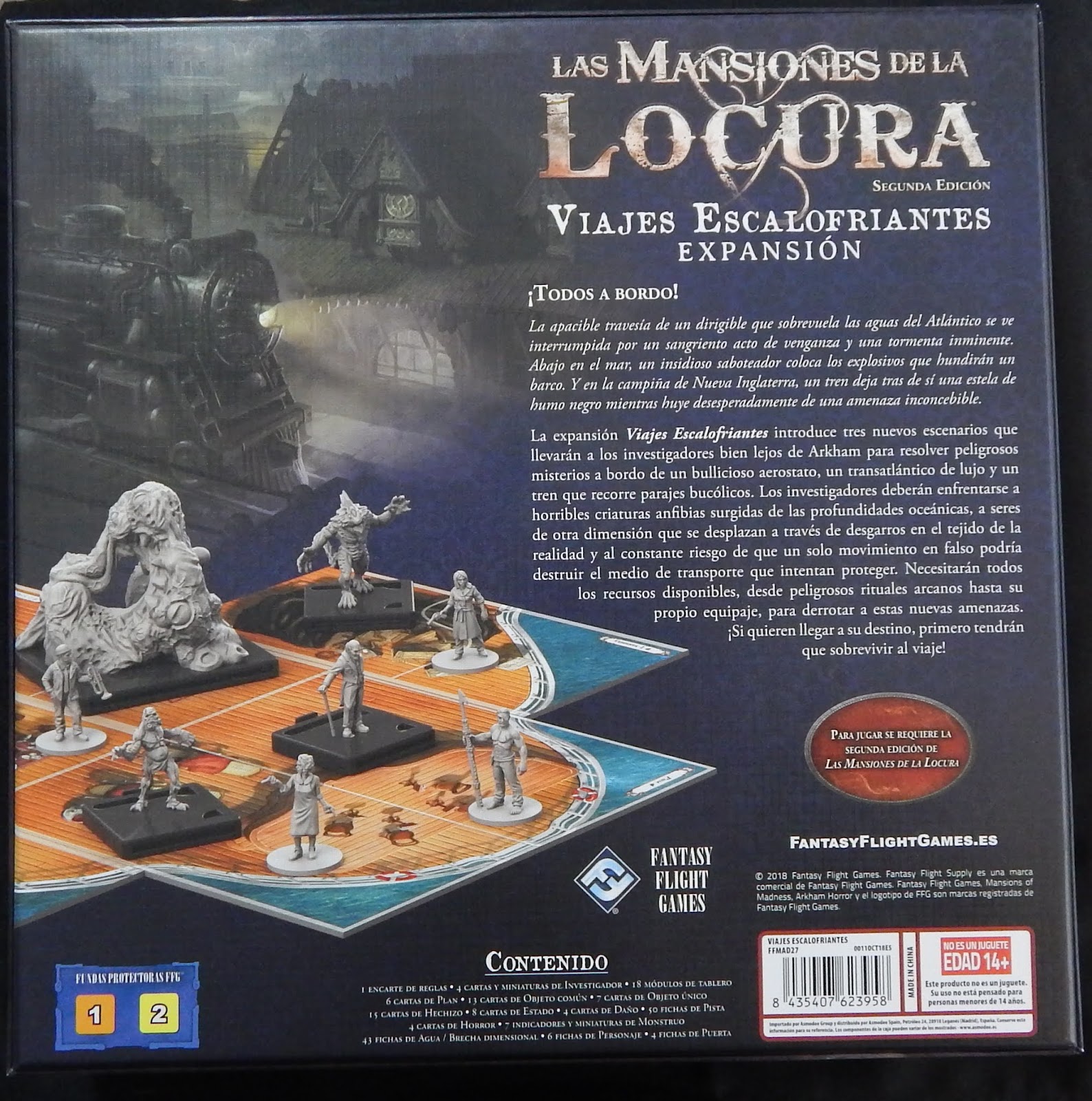 Las mansiones de la locura Viajes escalofriantes es una expansión para el juego de mesa Las mansiones de la locura segunda edición que añade tres nuevos escenarios al juego, que lleva a los investigadores lejos de Arkham Resuelve peligrosos misterios a bordo de un avión lleno de pasajeros, un transatlántico de lujo o un pintoresco tren. La Expansión Las Mansiones de la Locura Viajes Escalofriantes presenta 3 nuevos Escenarios que llevan a los Investigadores lejos de Arkham Resuelve peligrosos misterios a bordo de un Avión lleno de pasajeros, un Transatlántico de lujo o un pintoresco Tren. (Reimprimir Pesadillas recurrentes y Recuerdos reprimidos ya sería para nota) Saludos!.