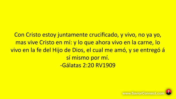 Con Cristo he sido crucificado, y ya no soy yo el que vive, sino que Cristo vive en mí;. Y lo que ahora vivo en la carne, lo vivo en la fe del Hijo de Dios, el cual me amó y se entregó a sí mismo por mí Gálatas 2 fe Salvador vida egoísmo crucifixión. Gálatas 2 Con Cristo estoy juntamente crucificado, y vivo, no ya yo, mas vive Cristo en mí y lo que ahora vivo en la carne, lo vivo en la fe del Hijo de Dios, el cual me amó, y se entregó á sí mismo por mí Read verse in La Biblia ReinaValera (Español).