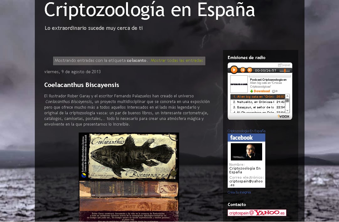 Escucha y descarga gratis los episodios de Podcast Criptozoología en España Escucha todos los podcast, conferencias, radios online gratis en tu iphone, android, windows phone y pc Pagina 4. Source Criptozoología en España Date January 11, 11 Cryptozoology and Tourism By Javier Resines Cryptozoology seems to remain a good PR tool for attracting tourists This, at least, appears to be the belief espoused byt the parties responsible for the Government of Navarre's new promotional campaign. Criptozoología en España viernes, 6 de junio de 14 La bestia que bebe de las huellas, en la Feria del Libro de Bilbao La bestia que bebe de las huellas, la reciente obra de Rober Garay y Fernando Palazuelos (conocidos de nuestros lectores tras la publicación de Tratado de tritones ) será presentada hoy en la Feria del Libro de Bilbao.
