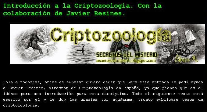 La criptozoología igualmente se dedica al estudio de presuntos animales desconocidos, los cuales poseen una gran lista de reportes a través del tiempo, y que en algunos casos son reportados por algunos supuestos testigos que informaron avistamientos ocasionales entregando una descripción coincidente con las características de animales extintos. En Podcast Criptozoología en España La peligrosa Edad Media española dragones, hombresmono y otros monstruos Javier Resines interviene el pasado sábado en Misterio en Red, el programa presentado y dirigido por Esteban Palomo. En Podcast Criptozoología en España La peligrosa Edad Media española dragones, hombresmono y otros monstruos Javier Resines interviene el pasado sábado en Misterio en Red, el programa presentado y dirigido por Esteban Palomo.