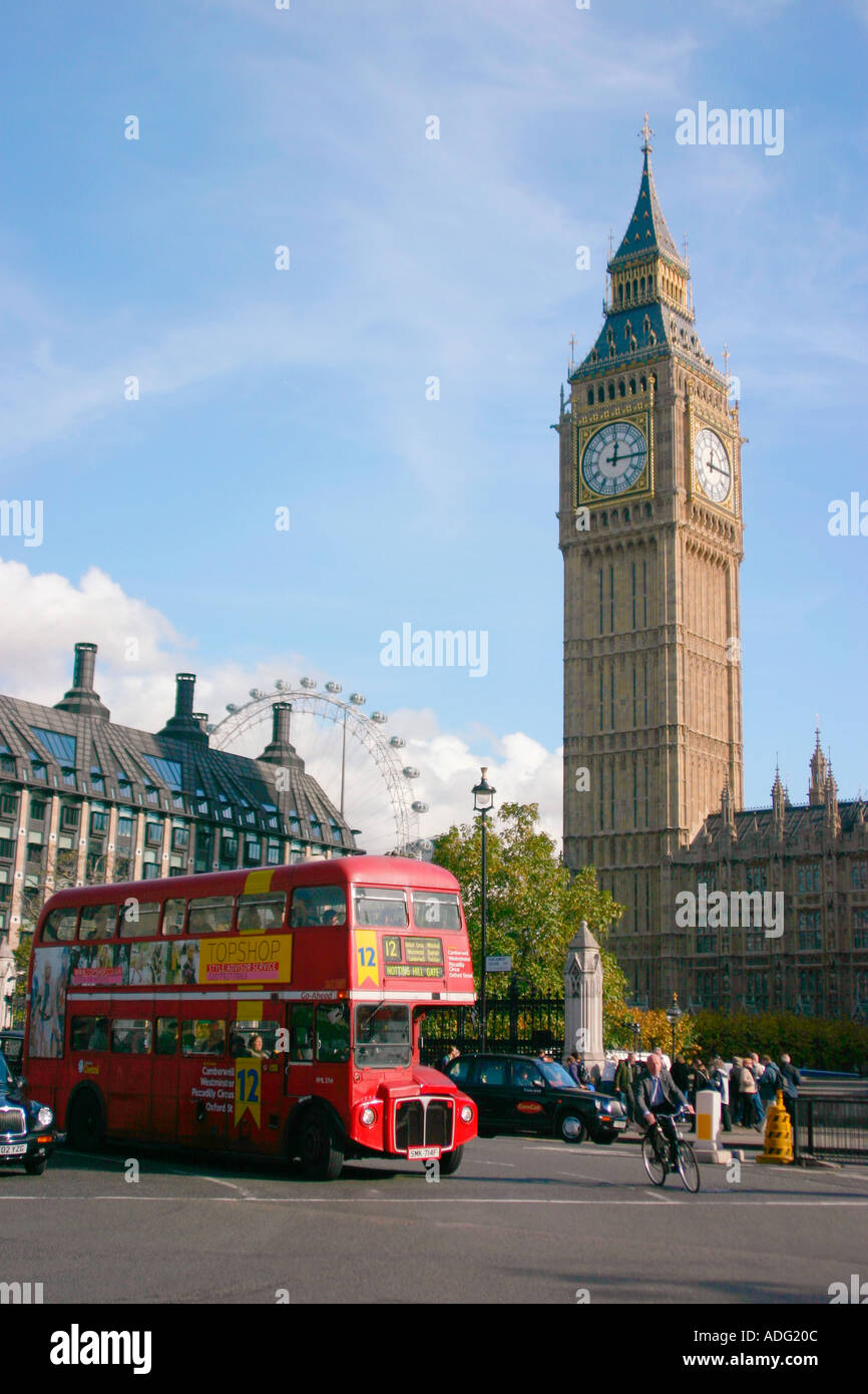 Red Bus In Front Of Big Ben Houses Of Parliament And London Eye Stock Photo Alamy