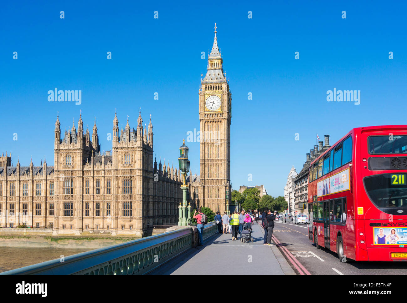 Red Bus Passing Big Ben Houses Of Parliament And Westminster Bridge Stock Photo Alamy