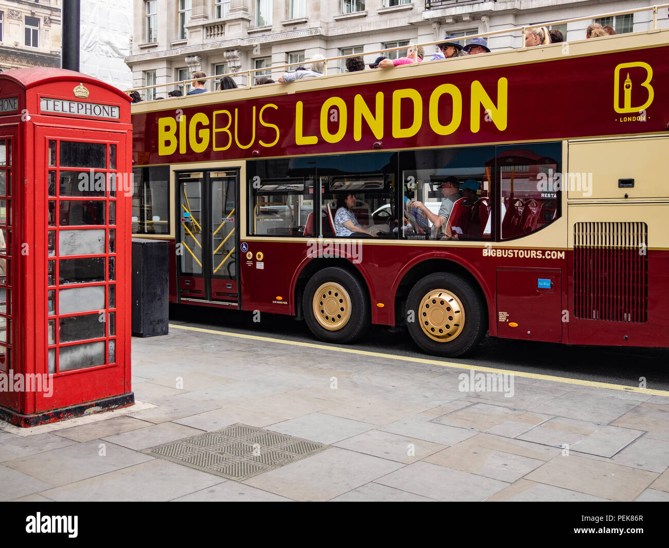 Big Bus Open Tour Bus And London Red Telephone Booth London England Uk Stock Photo Alamy
