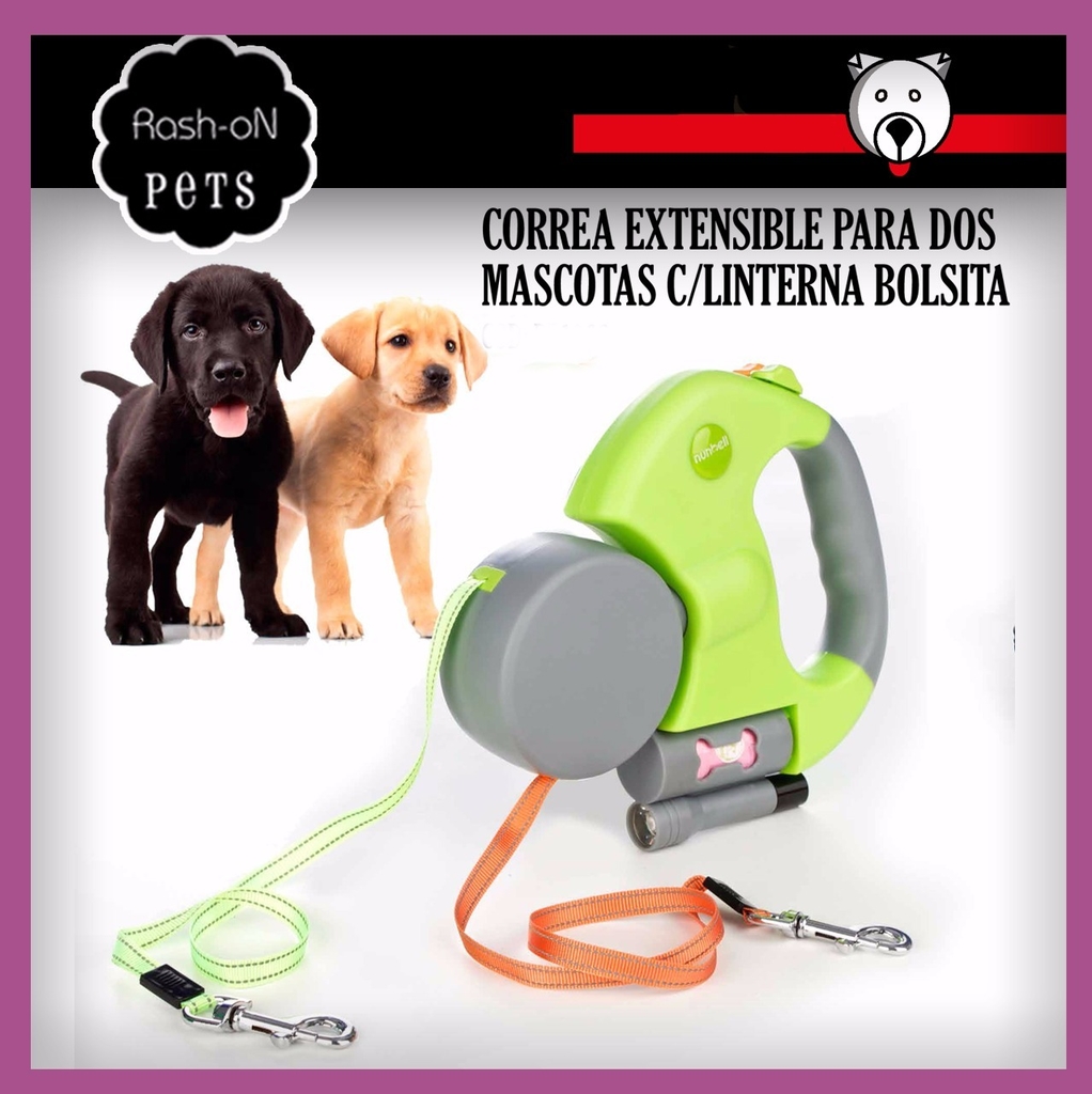 Correa Doble Para Perros Retractil C Linterna Y Porta Bolsas