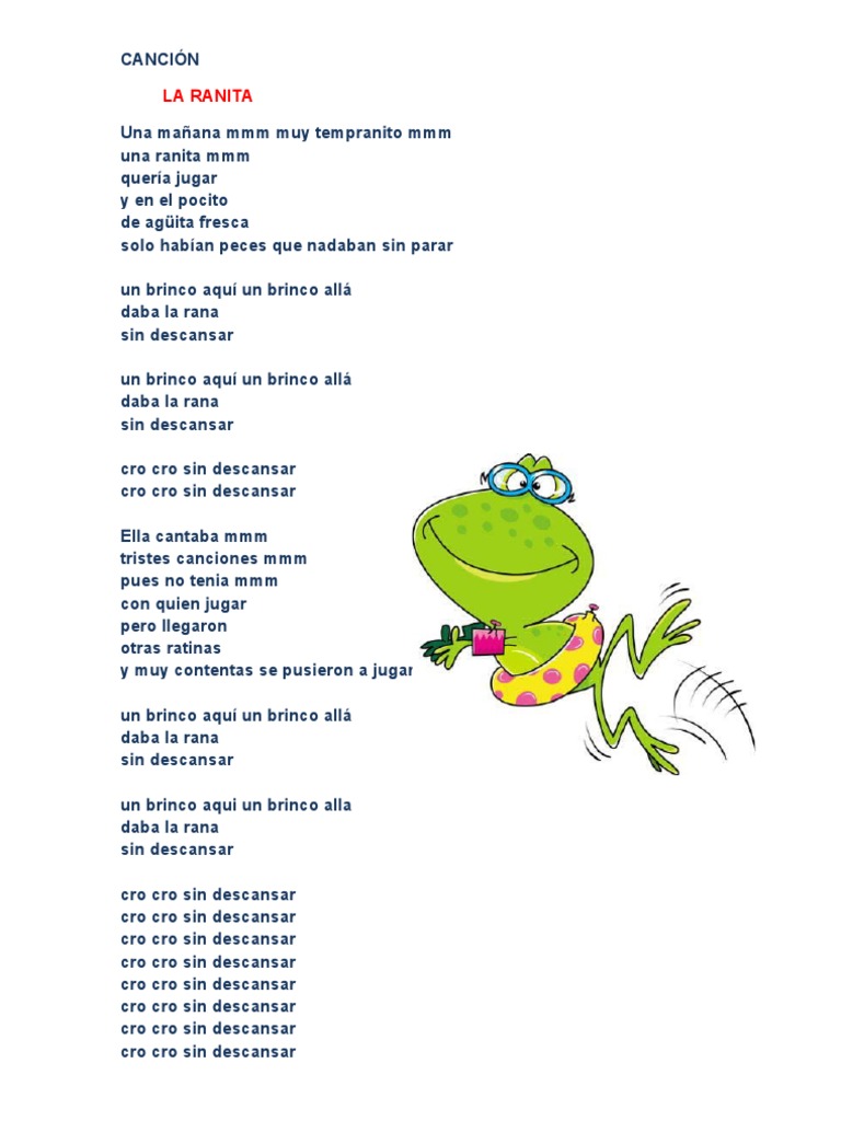 Canciones de ranas. Cuando el ratón se puso a cantar, vino el gato y le hizo callar. Canción de la rana Canción de la rana ID Language Spanish School subject Lengua Castellana Grade/level 1º 2. La rana cucú Canción infantil Cucú cantaba la rana cucú debajo del agua cucú pasó un caballero cucú con capa y sombrero cucú pasó una señora cucú con falda de cola cucú pasó un marinero cucú vendiendo romero cucú le pidió una ramito cucú no le quiso dar cucú y se echó a llorar.