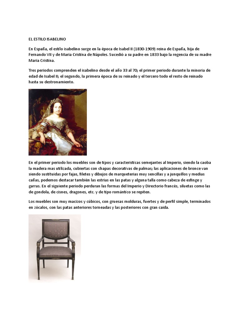 época isabelina Partidario de Isabel II en España También s Manifestación artística de los reinados de Isabel I o II de España y de Isabel I de Inglaterra escritorio isabelino También m. Aunque sin pertenecer en la mayoría de los casos a la época histórica estrictamente considerada "Isabelina " (), su estética se corresponde a las pautas clasicista e historicistas que se marcaban en el programa isabelino de dignificación de la imagen de la ciudad y desarrolladas en su mayor esplendor años después, dentro de la etapa histórica considerada como la Restauración. Cómoda isabelina, Cómoda antigua isabelina, con marquetería, en buen estado de conservación tiene una tapa de mármol Se denomina estilo isabelino al desarrollado en las artes decorativas, especialmente mobiliario, en España durante el reinado de Isabel II () Sucedió al.