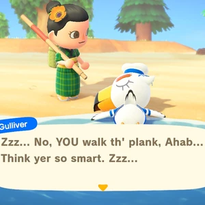 Sie befinden sich hier Willkommen » Animal Crossing New Leaf » Gulliver Gulliver Gulliver kann an einem zufälligen zwischen Montag und Samstag ab 6 Uhr morgens an deinem Strand auftauchen Er wird dort liegen und du musst ihn ein paar Mal ansprechen, bis er aufwacht. Gulliver is a travelling seagull in sailor clothes who will ocassionally get washed ashore to your town's beach Once he awakens, he will ask you to help him find out where he's originally headed to Should you answer correctly he will send you a souvenir through mail. Although it's just Gulliver doing pirate cosplay, he offers a.