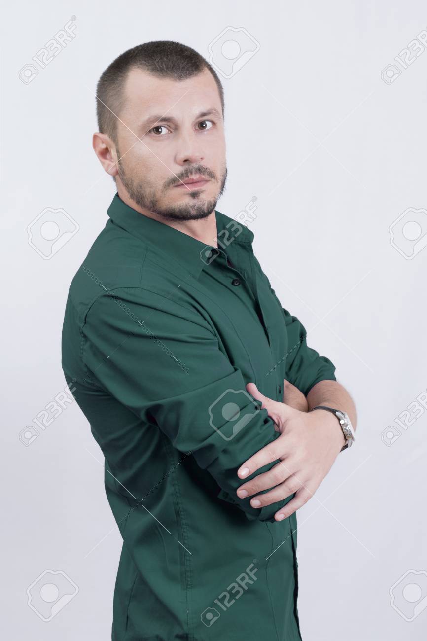 Hombre Que Presenta Con La Camisa Verde En Blanco Foto De Archivo Imagen De Frente Fondo