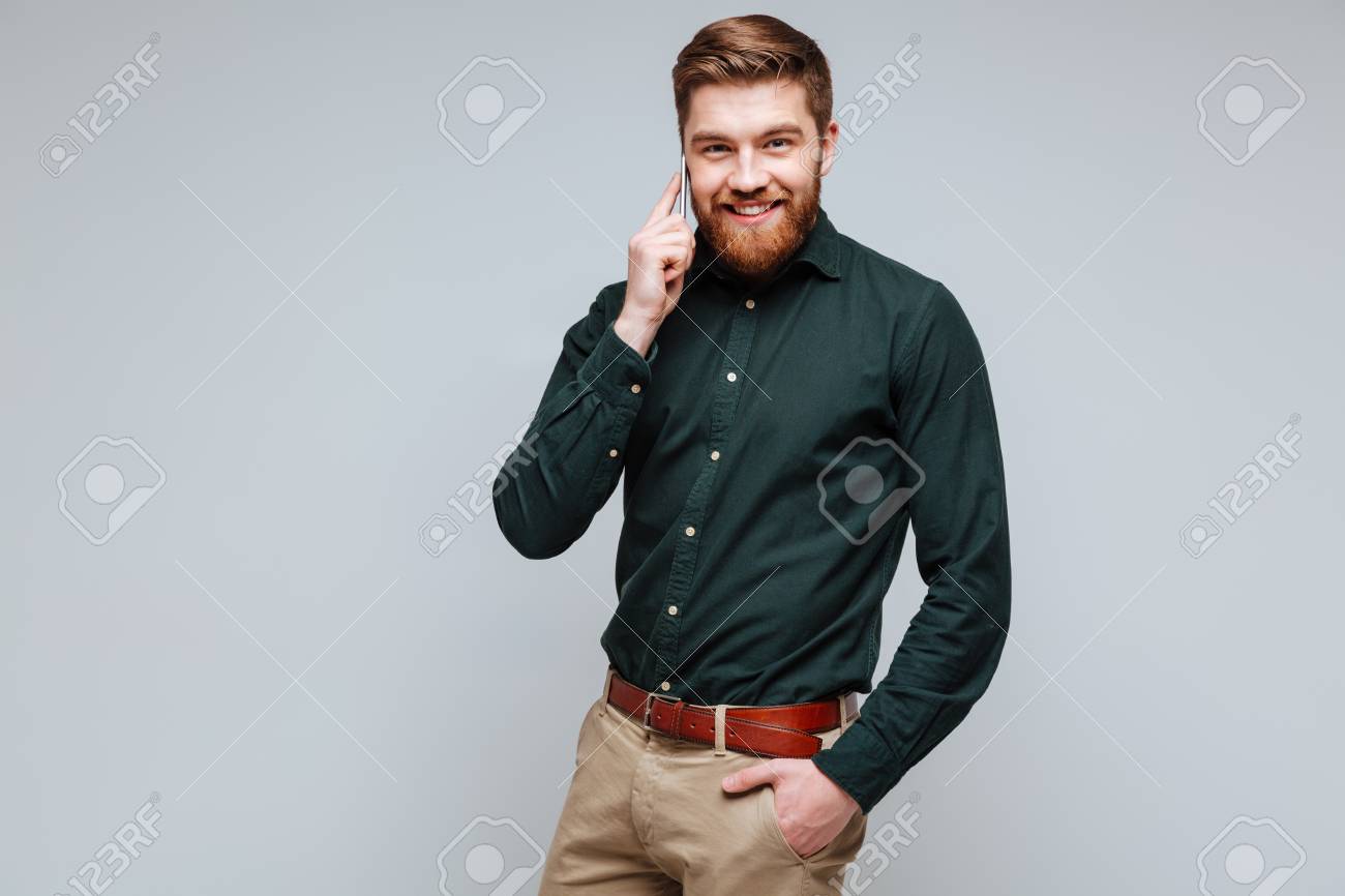 Hombre Barbudo Sonriente En Camisa Verde Que Habla En El Telefono Que Sostiene El Brazo En El Bolsillo Y Que Mira La Camara Fotos Retratos Imagenes Y Fotografia De Archivo Libres De