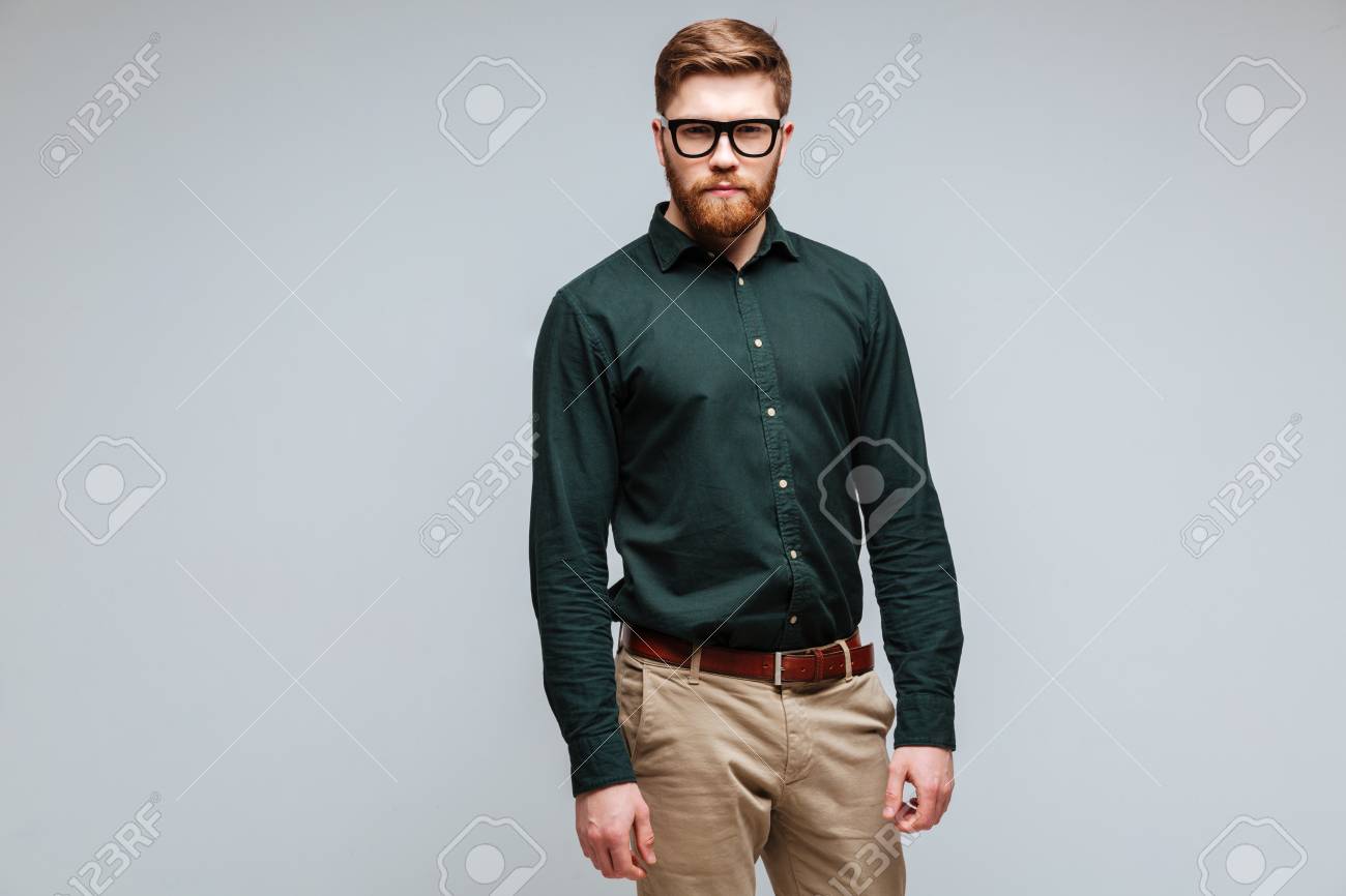 Tranquilo Hombre Barbudo En Camisa Verde Y Anteojos Que Posando En Estudio Y Mirando A Camara Fotos Retratos Imagenes Y Fotografia De Archivo Libres De Derecho Image