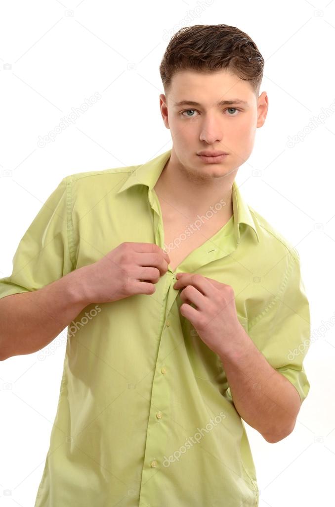 Retrato De Un Joven Hombre De Negocios Quitandose La Camisa Verde Hombre Haciendo Striptease Foto De Stock C Luanateutzi
