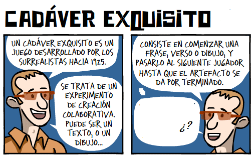 1 El cadáver exquisito en su origen consistía generalmente dibujar o escribir algo en una hoja blanca, doblar, pasar la hoja al jugador de al lado, continuar el escrito o dibujo sin ver lo que realizó el anterior, y así, sucesivamente, hasta que todos los jugadores hayan intervenido. Y sí, nos decía un cadáver exquisito, es cuando entre varios, hacen un solo dibujo, o un solo poema, o una sola canción Uhhuh Y cada quien le pone una pate, y juega a a dejarlo como para que el otro siga en esas partes que iba haciendo una especie de franquicia. El cadáver exquisito se juega entre un grupo de personas que escriben o dibujan una composición en secuencia Cada persona sólo puede ver el final de lo que escribió el jugador anterior.