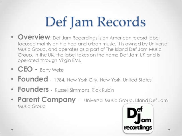 Def American Recordings was founded by Rick Rubin in 19 after splitting with thenpartner Russell Simmons and Def Jam Recordings because of the former’s increasingly eclectic tastes The firstever Def American release was Slayer’s Reign in Blood, which, ironically, had a Def Jam logo on its first pressingHowever, because Simmons felt that it was not in line with Def Jam, and because. When it comes to social media, Def Jam Recordings is No 1 No, really — the Universal Music Group label boasts the largest number of followers on Instagram, Twitter, Facebook and YouTube as. Def Jam Records Profile Use for company credits if credited as "Def Jam Records" Parent Label UMG Recordings, Inc l Label Edit Label ;.