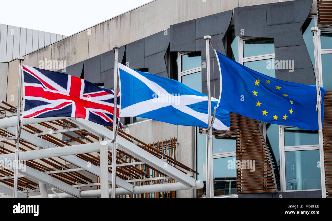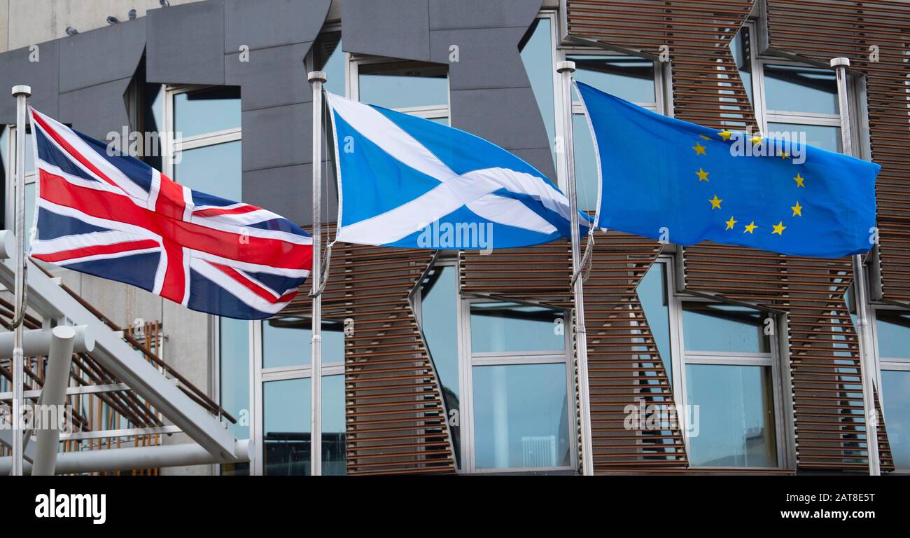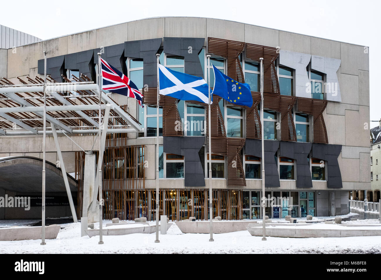 Escocia Edimburgo El Edificio Del Parlamento Escoces Con Union Jack Escocesa Y Banderas De La Ue En El Exterior Fotografia De Stock Alamy