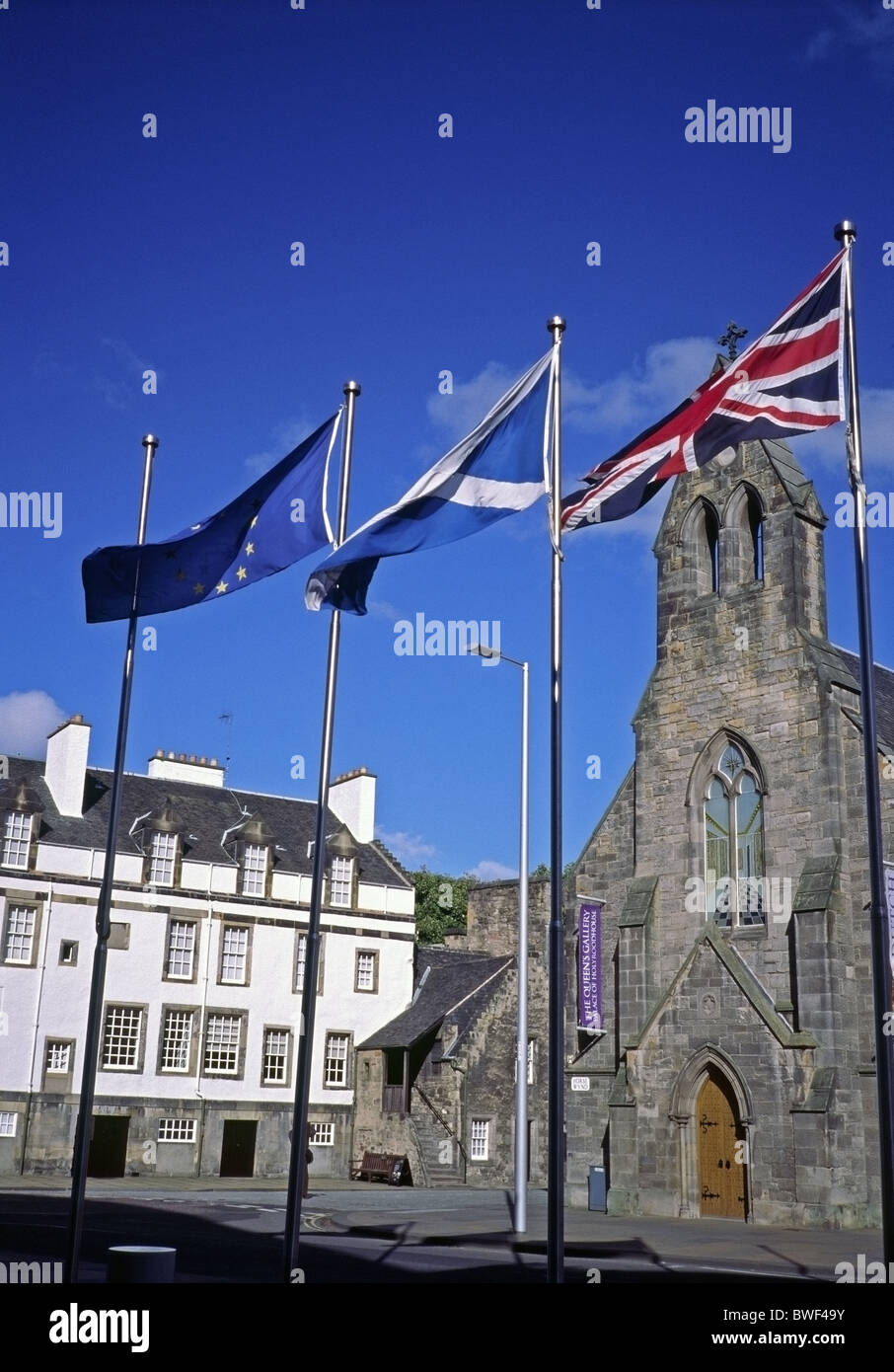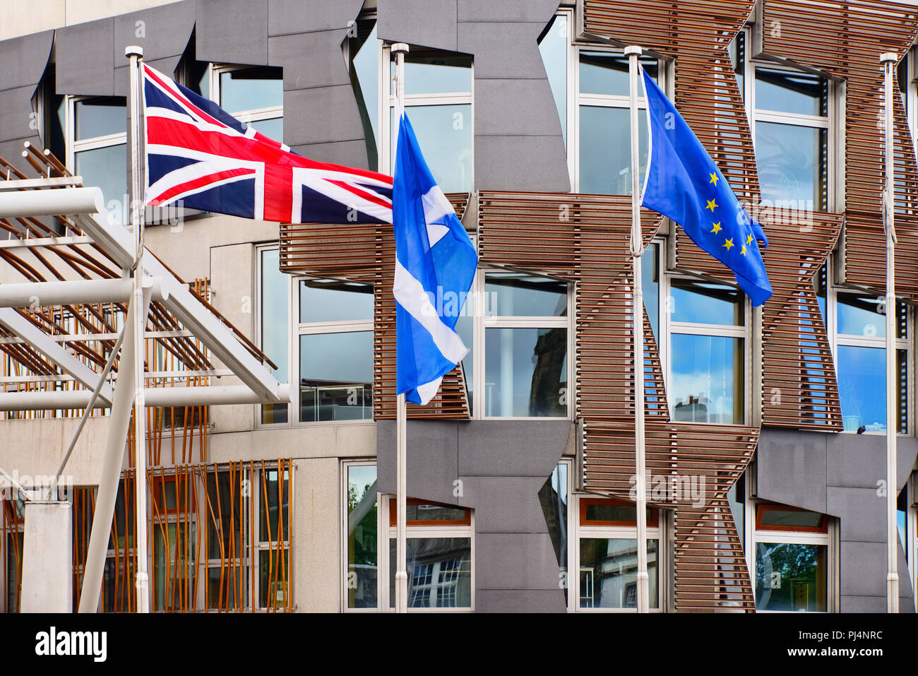 Banderas Fuera Del Edificio Del Parlamento De Escocia En Holyrood En Edimburgo Escocia Reino Unido Fotografia De Stock Alamy