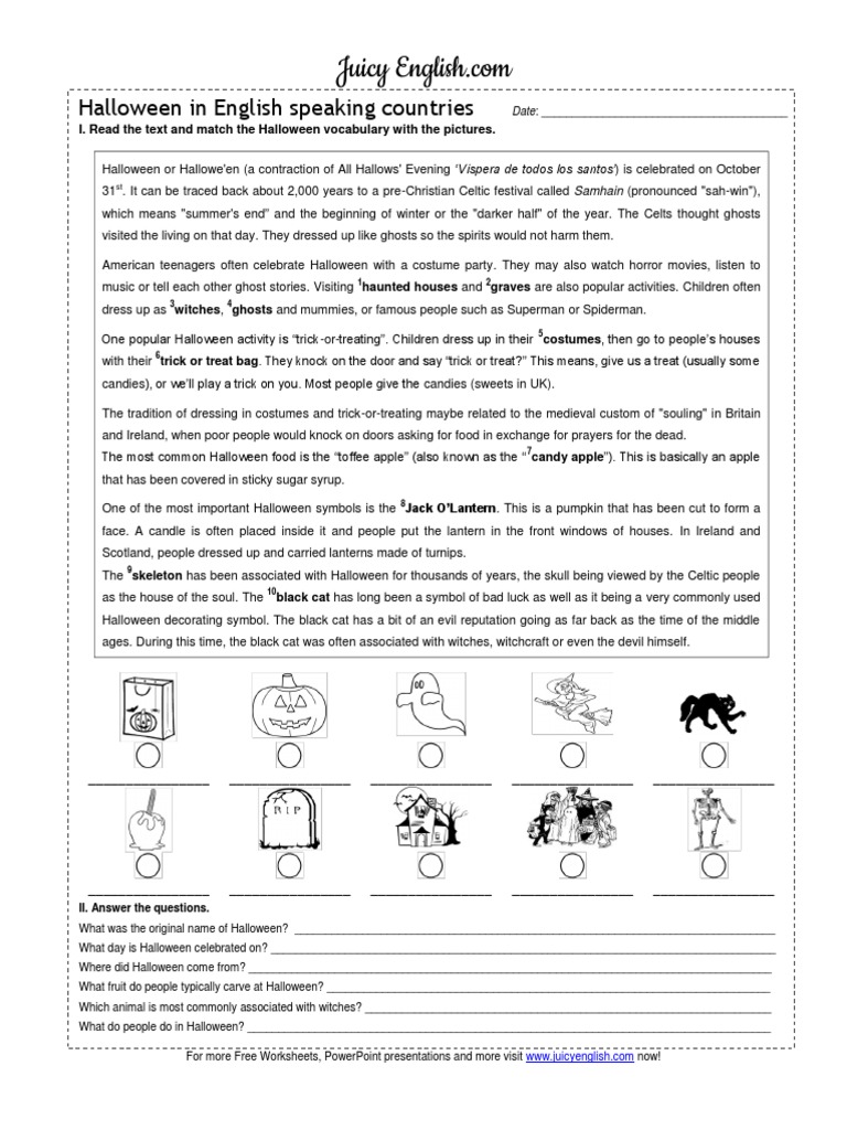 A lot of work went into preparing this game for middle/high school. Daily Activities (Getting Up) Th ree short dialogs for vocabulary, listening, and speaking practice Extension activity on attached Page 2 Answer Key attached on Page 3 Level:. Americans and Canadians have adopted Halloween in a big way, but Halloween traditions actually come from 16th-century Ireland, Scotland and England.