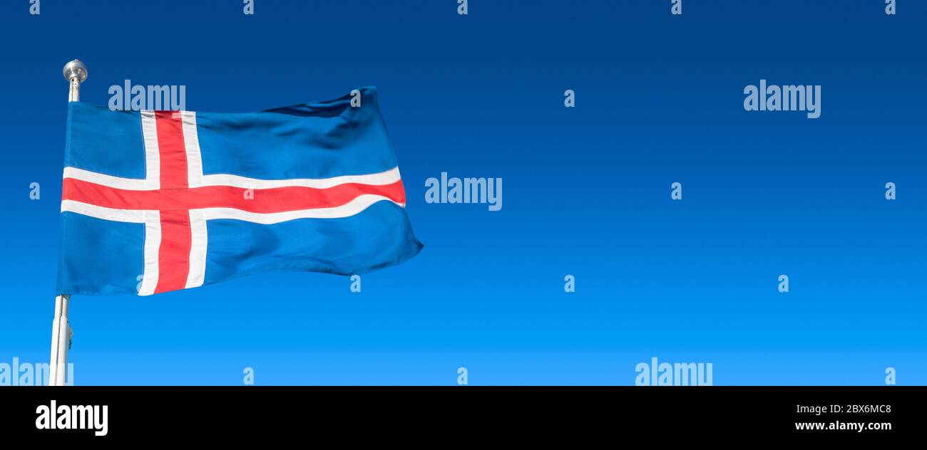 Bandera Con Bandera Nacional Islandesa Azul Con Cruz Roja Y Blanca Sobre Fondo Azul Cielo Con Espacio De Copia Para Texto Fotografia De Stock Alamy
