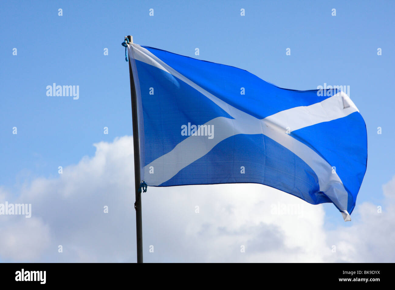 Saltire Scottish Bandera Con La Cruz De San Andres Blanca Sobre Fondo Azul Contra El Cielo Azul Con Nubes Blancas Fotografia De Stock Alamy