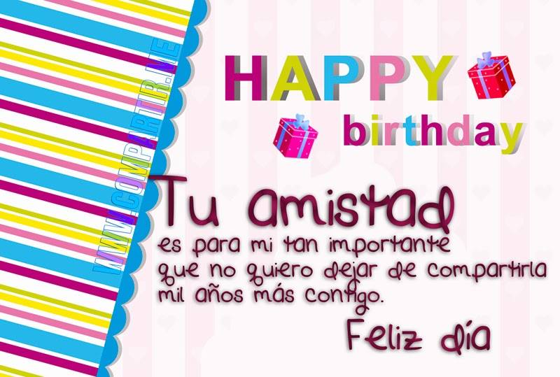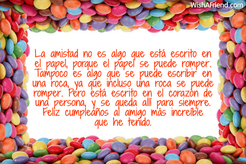 Que grato fue encontrarte en el camino de la vida, hoy celebramos un año más, que seguro será mucho mejor que el anterior Disfrútalo con toda la libertad y disciplina que. DULCES CUMPLEAÑOS Una persona tan dulce como tú merece un pastel que le haga honor, Una fiesta de Cumple llena de alegría y sabor y la compañía de sus amigos y de su amor Espero que todos tus deseos se hagan realidad Porque nadie se lo merece más que tú, en verdad MI MEJOR AMIGO Siempre fue mi destino ser tu amigo y no tu enemigo. Mi amigo extranjero y hermano de corazón, no hay mejor regalo que ofrecerte mi amistad incondicional, cuentas conmigo y celebremos juntos tu.