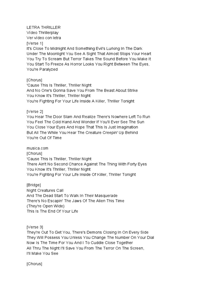 Michael Jackson It's close to midnight something evil's lurkin' in the // Es casi medianoche algo malvado acecha en la oscuridad. Michael Jackson Thriller (tradução) (Letra e música para ouvir) 'Cause this is thriller / Thriller night / And no one's gonna save you / From the beast about to strike / You know it's thriller / Thriller night / You're fighting for your life / Inside a killer / Thriller tonight. LETRA CANCION THRILLER (EN ESPAñOL) de MICHAEL JACKSON, Lyrics CANCIONES de MICHAEL JACKSON LETRAS, Letras traducidas, letras en espanol, musica, lyrics.