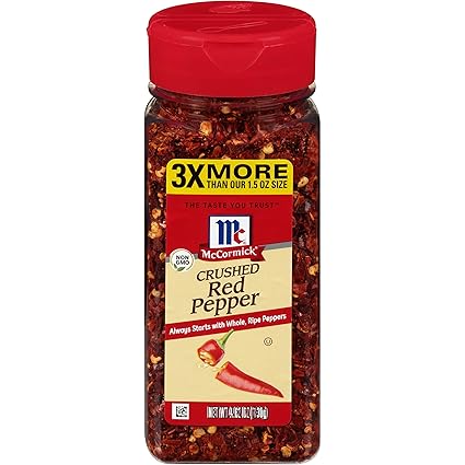 Crushed red pepper adds a kick of heat and flavor to any dish Use to enliven pastas, pizza, sautéed vegetables, and global dishes 15 oz jar. McCormick Crushed Red Pepper always starts with whole, ripe peppers We blend the optimal levels of seeds and pods to deliver bold flavor and balanced heat Pure crushed red pepper has a vibrant, red color from the flakes and is lightly flecked with yellow seeds It has a slightly fruity, chili pepper aroma with a consistently spicy heat. Text Ingredients View Recipe Directions In a Dutch oven, saute red peppers, carrots, onions, celery and garlic in oil until tender Stir in the broth, rice, thyme, salt, pepper and cayenne;.