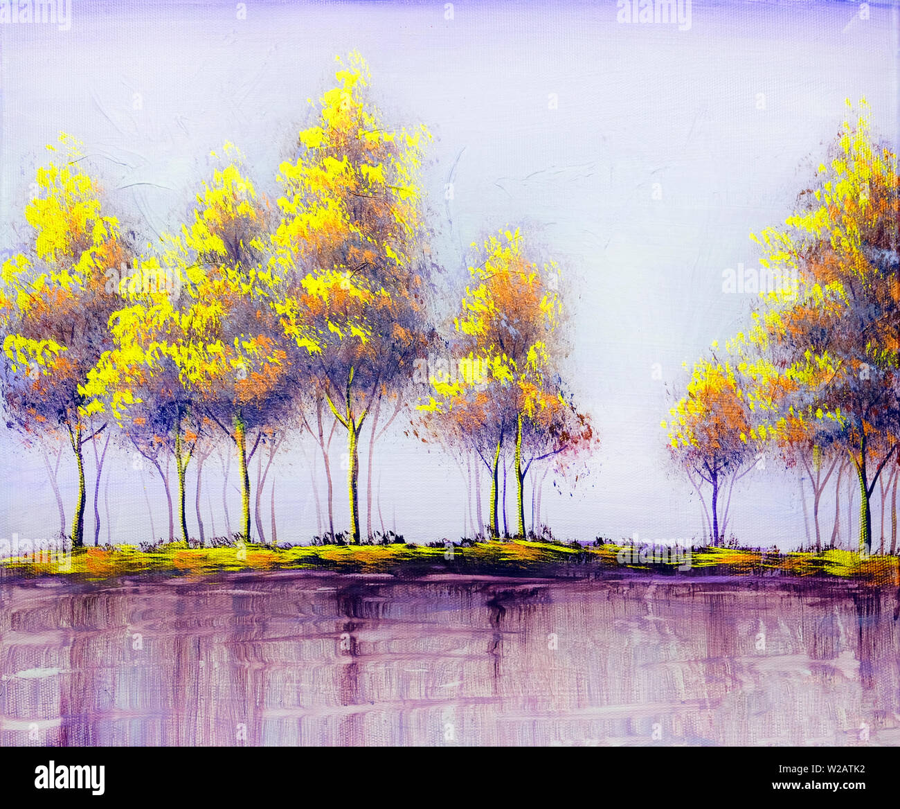 Grandes Arboles En El Sol De La Manana Rusa En El Paisaje Del Rio Bello Arte Pintado A Mano Pintura Acrilica Foto De Archivo Imagen De Manana Rusa