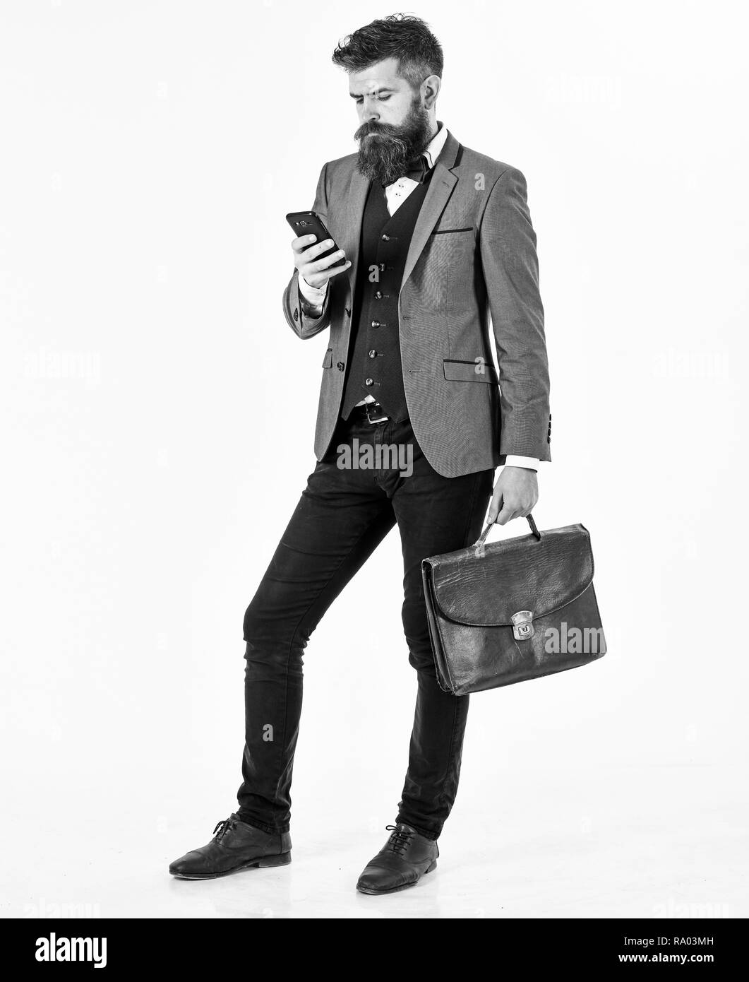 Hombre Brutal Parece Ocupado Hombre Barbado Viste Traje Inteligente Y Utiliza El Smartphone Chico Con Cara Seria De Moda Peinado Y Maletin Exito Negocios Nueva Tachnology Internet Concepto De Moda Masculina Fotografia