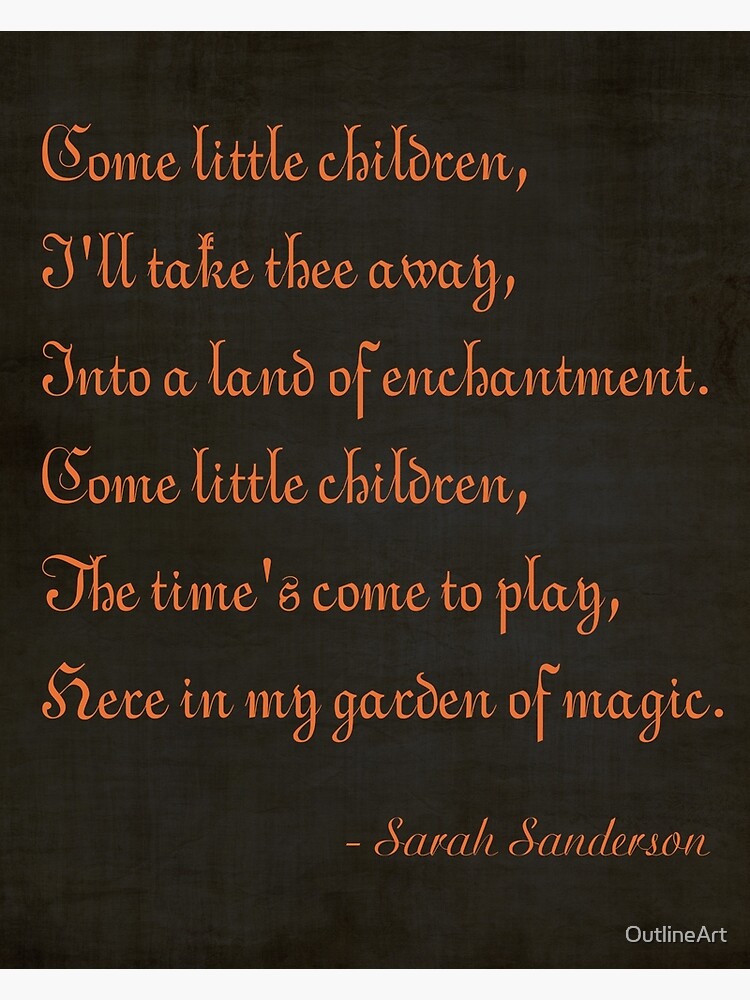 "Come Little Children" By Edgar Allan Poe Here's a little poem by Mr Poe that in fact is the lyrics of one of our background songs The first time that we heard this song was in 1993 on a halloween movie "Hocus Pocus" from Disney , they had to change the word "Shadows" for "Magic", because it was a movie for children. I love come little children but my favorite is the hound and the fox come little children I am 11 years old and am in 5th grade Vera Jahnke Like Wed, 28/10/ 12 Hello Kitty 😺, thanks for your nice comment I am glad, you like it!. "Come Little Children" is a song from the 1993 liveaction Disney film Hocus Pocus It features Sarah Sanderson as she sings a hypnotizing song that lures in the town's children The song was performed by Sarah Sanderson's actress, Sarah Jessica Parker 1 Lyrics 2 Other Appearances 3 Gallery 31 Images 32 Videos 321 Official 322 Covers 4 Trivia The song was later sung again by Sarah.