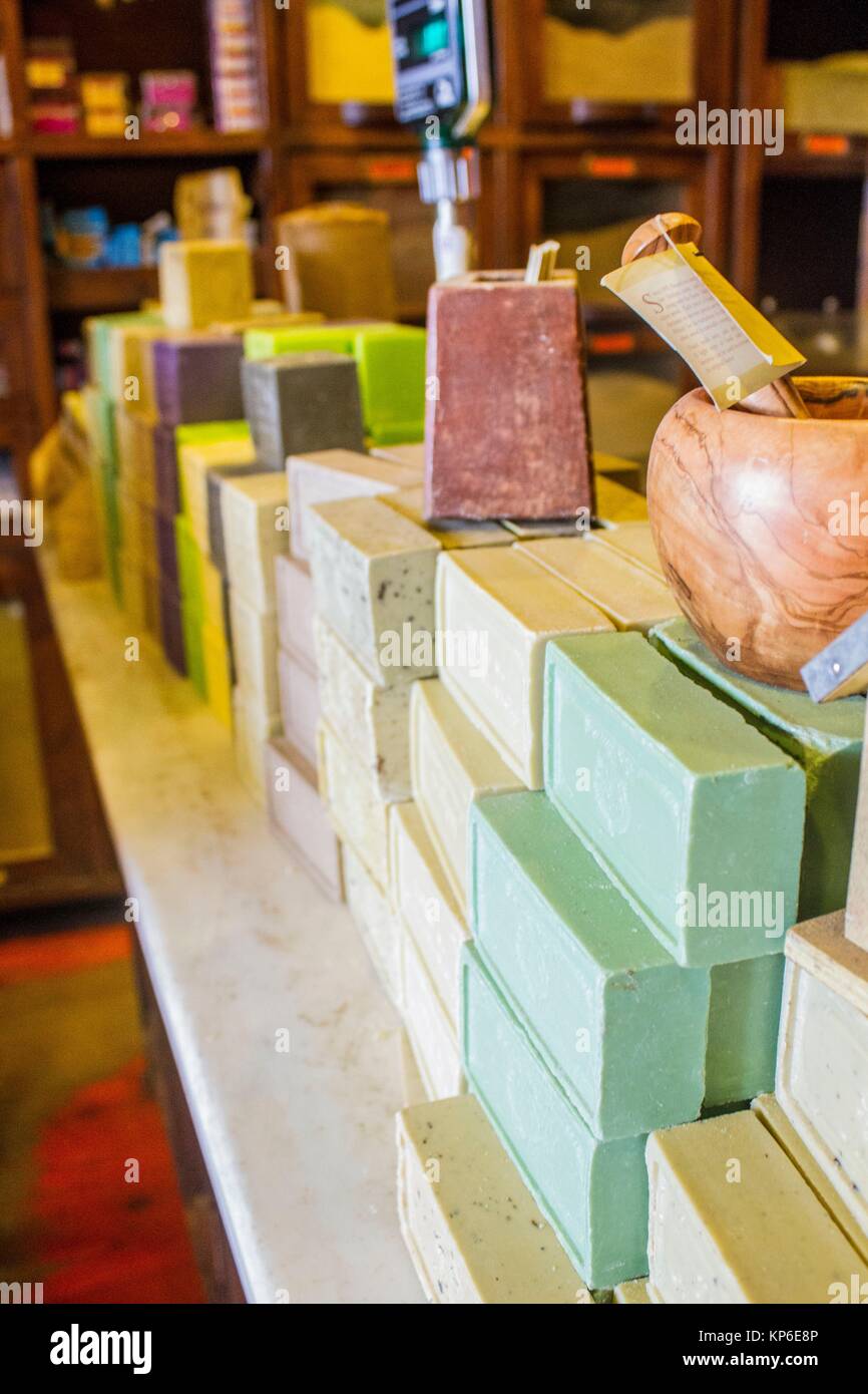 Colorido Verde Amarillo Marron Aceite De Oliva Jabones Caseros En La Pantalla Para La Venta En La Calle Muestra Fuera De La Tienda A Granel Fotografia De Stock Alamy