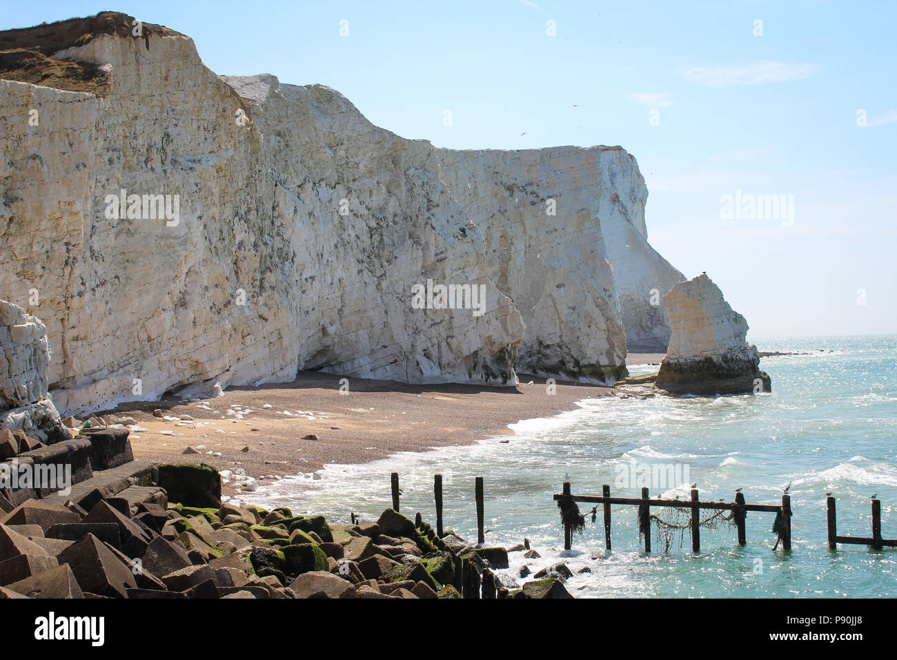 Stock photo of the Seven Sisters Cliff Formation near Eastbourne, East Sussex, England, UK. The Seven Sisters is a series of chalk cliffs that can be found on the coast of East Sussex, located between Seaford and Eastbourne Each cliff has its own name, but the collective name is a bit deceiving as there are, in fact, eight peaks located in the Seven Sisters range. The Seven Sisters are a series of chalk cliffs by the English Channel They form part of the South Downs in East Sussex, between the towns of Seaford and Eastbourne in southern England They are within the South Downs National Park which is bounded by the coast, the Cuckmere and the 59 road.