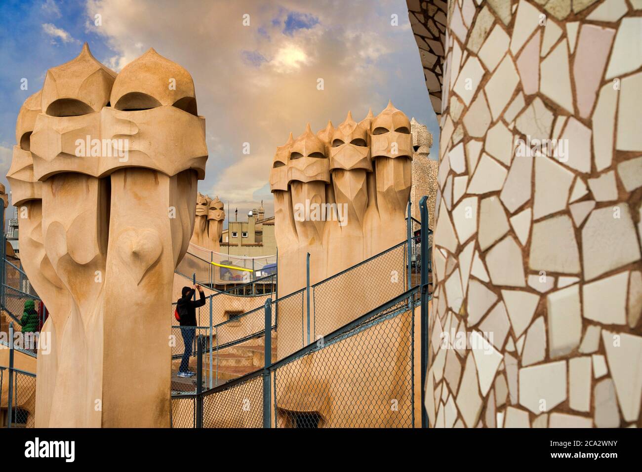 Casa Mila Or La Pedrera Rooftop Chimneys Designed By Antoni Gaudi In Stock Photo Alamy