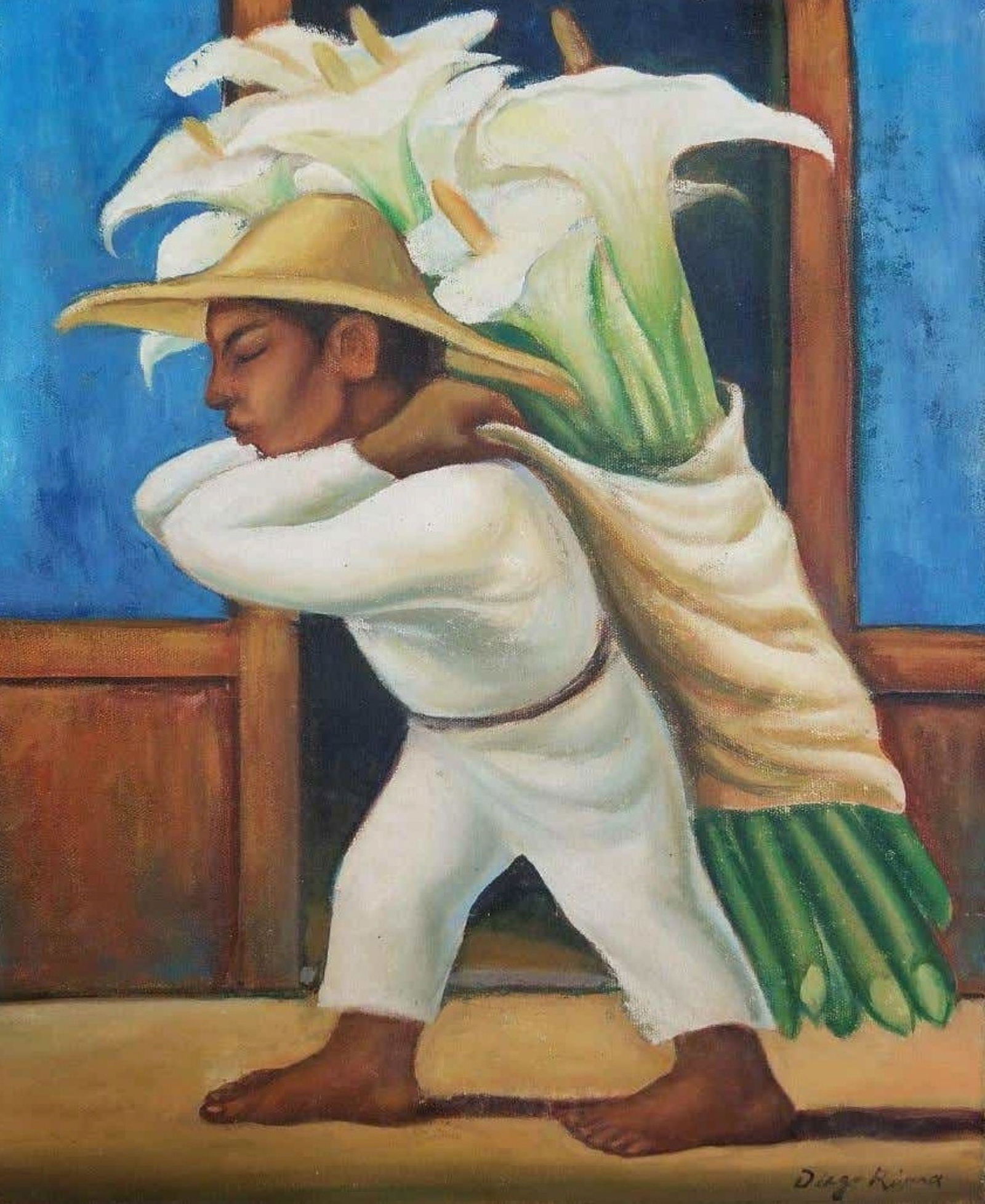 Diego María de la Concepción Juan Nepomuceno Estanislao de la Rivera y Barrientos Acosta y Rodríguez, known as Diego Rivera (Spanish pronunciation ˈdjeɣo riˈβeɾa;. In 1935, Diego Rivera masterfully created ‘The Flower Carrier’ (known in its original language as ‘Cargador de Flores’) Like many of Rivera’s paintings, ‘The Flower Carrier’ imparts simplicity, yet exudes much symbolism and meaning The vibrant colors are rubbed into the masonite, a most common method for painting on hard surfaces. This painting was painted in 1942 and is one of Diego Rivera most famous paintings He painted quite a few paintings of calla lilies throughout his life This painting has a peasant girl with a blue scuff and barefoot holding a bundle of white calla lilies "The calla lily, a sensual, sculptural flower and quintessential example of Mexico's exuberant flora was celebrated by Rivera many times, particularly in frescoes depicting peasants with indigenous features carrying bundles or.