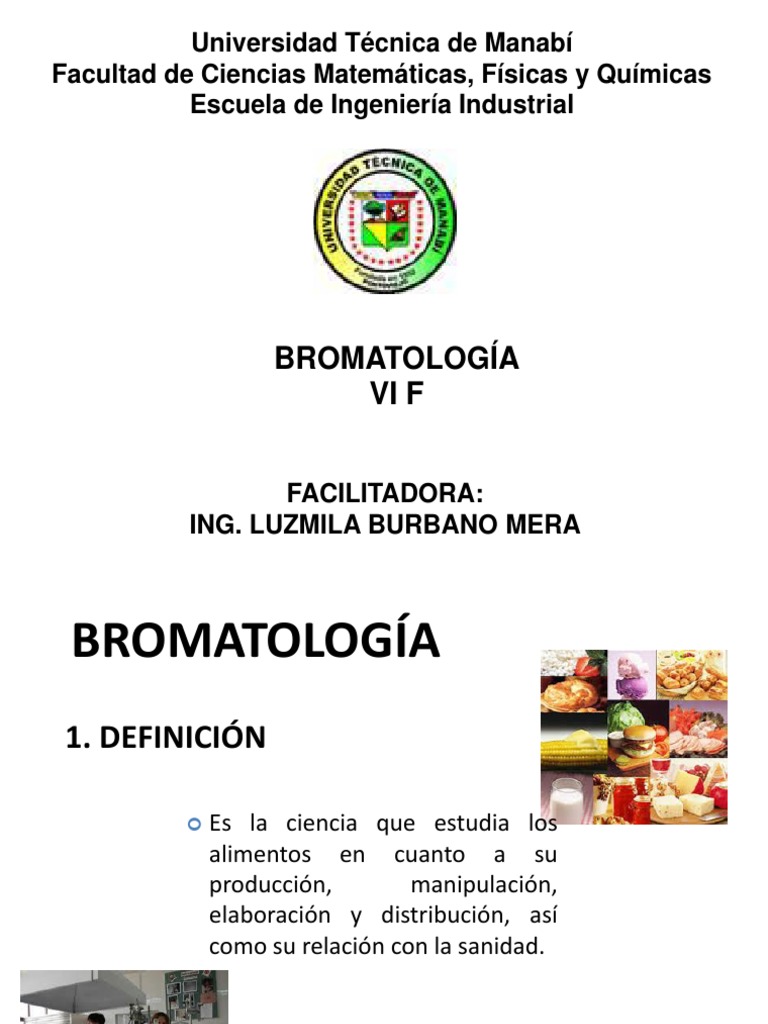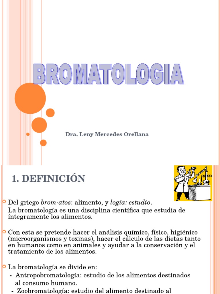 Del latín bromato (alimento) y logía (), la bromatología es una disciplina importante en la industria alimentaria, ya que se ocupa del estudio de los alimentos en todos los aspectosSu composición, valor nutritivo, higiene y toxicidad, son estudiados en un proceso integral desde la fabricación, conservación, almacenamiento y distribución, para que el alimento llegue en estado correcto. DEFINICIÓN DE LA LECHE La definición de leche está dada por su origen y hace referencia al producto de la secreción normal de la glándula mamaria de animales bovinos sanos, obtenida por uno o varios ordeños diarios, higiénicos, completos e ininterrumpidos. Bromatología De Wikipedia, la enciclopedia libre Ir a la navegación Ir a la búsqueda Laboratorio de bromatología Equipo de un laboratorio de bromatología Bromatólogos durante su trabajo La ciencia de los alimentos o bromatología es la ciencia de la naturaleza dedicada al estudio de los alimentos A menudo se confunde con "tecnología alimentaria".