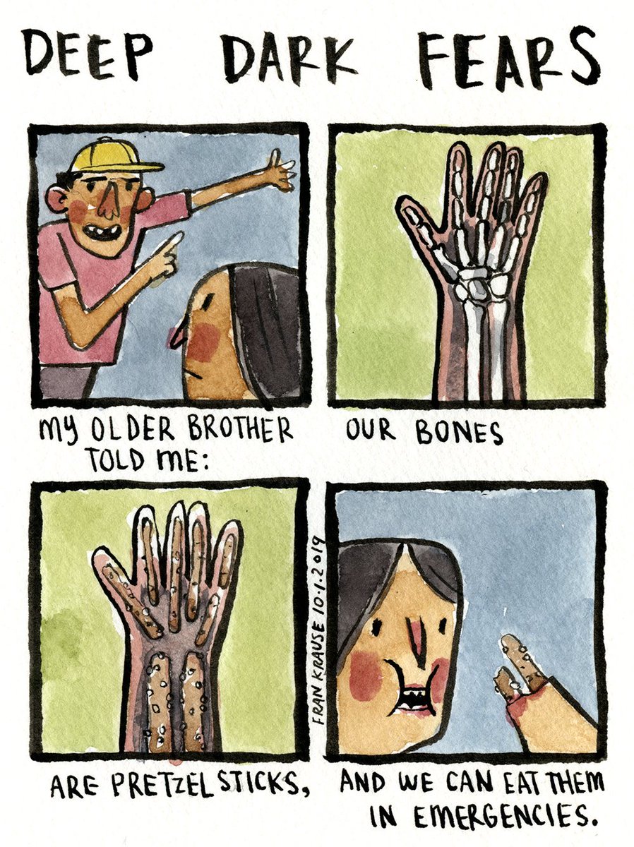 In Deep Dark Fears, animator, illustrator, and cartoonist Fran Krause brings these fears to life in 101 vividly illustrated comics inspired by his wildly popular web comic and based on real fears submitted by online readers Deep Dark Fears reveals a primal part of our humanity and highlighting both our idiosyncrasies and our similarities QUOTES “The great thing about Deep Dark Fears is that you’ll find that you’re not the only one with arguably irrational fears;. Illustrator Fran Krause asked people to tell him their weirdest and most irrational fears to turn them into witty comics Sometimes these irrational fears can be traced from the early childhood memories or come as a result of some vivid world explanations grownups used to tell you But sometimes, however, they are just inexplicable The project, which started with Krause‘s own phobias, now. Happy Holidays from Deep Dark Fears!.